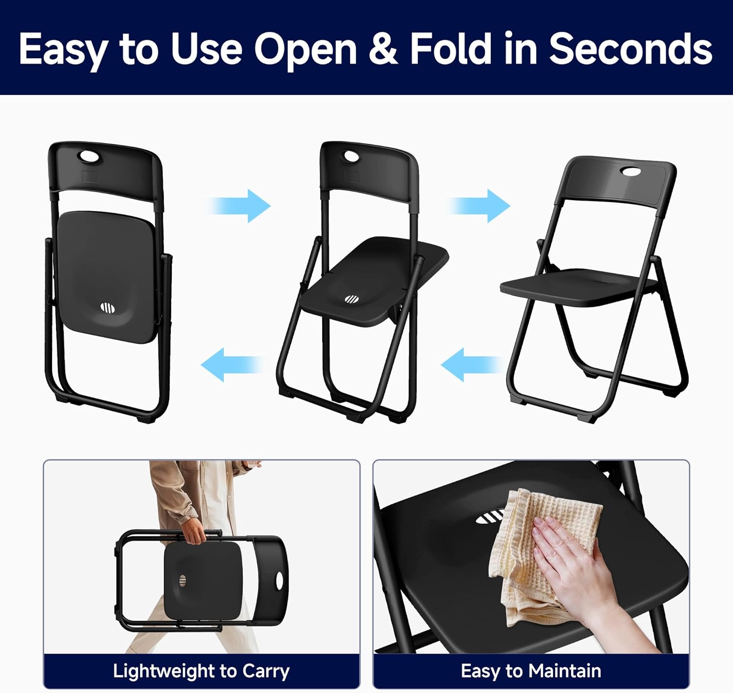 • Space Saving Portability: This lightweight plastic folding chair is easy to carry. Its foldable design enables quick setup and storage, making it ideal for various indoor and outdoor gatherings.