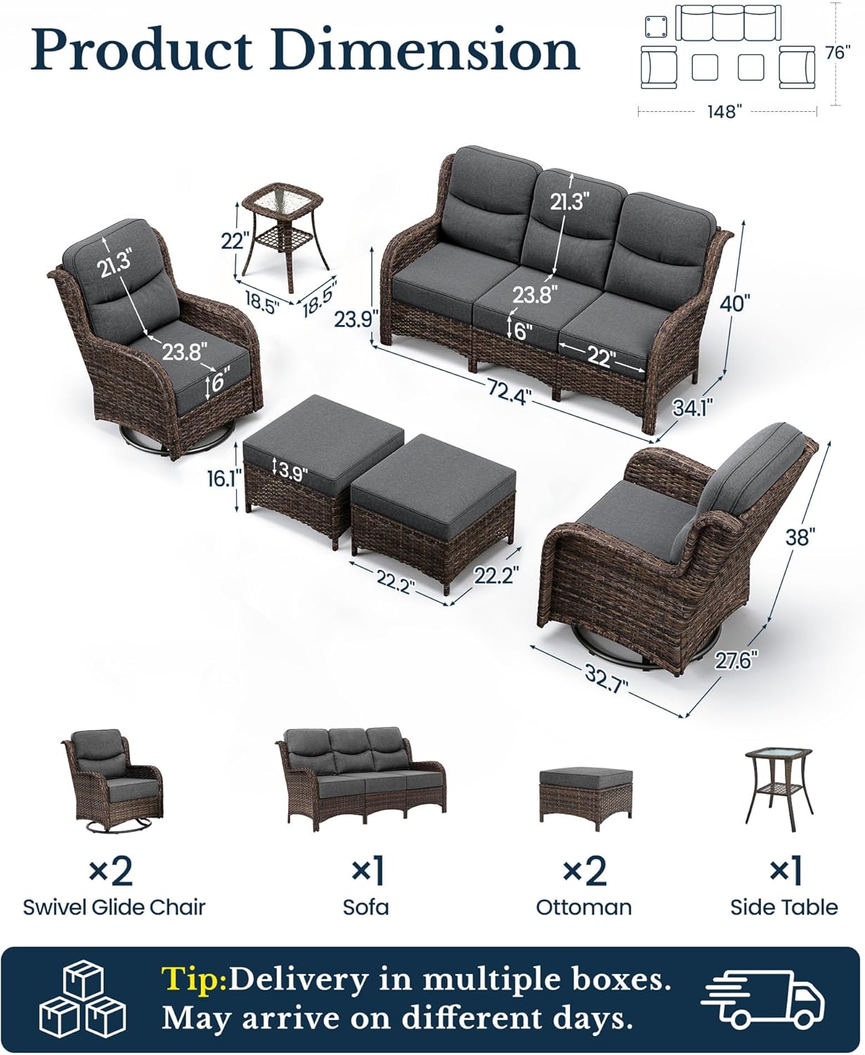 - 6-Piece Outdoor Set, Perfect for Gatherings: This 6-piece set includes 1 couch, 2 swivel chairs, 2 ottomans and 1 tables, with a footprint of 150"L x 80"W for decks, poolside patios and sunrooms. Ottomans can tuck under the coffee table to save space when not in use, and can act as footrests or extra seats when needed. The set provides ample seating and comfortably accommodates up to 7 people for family leisure and social gatherings