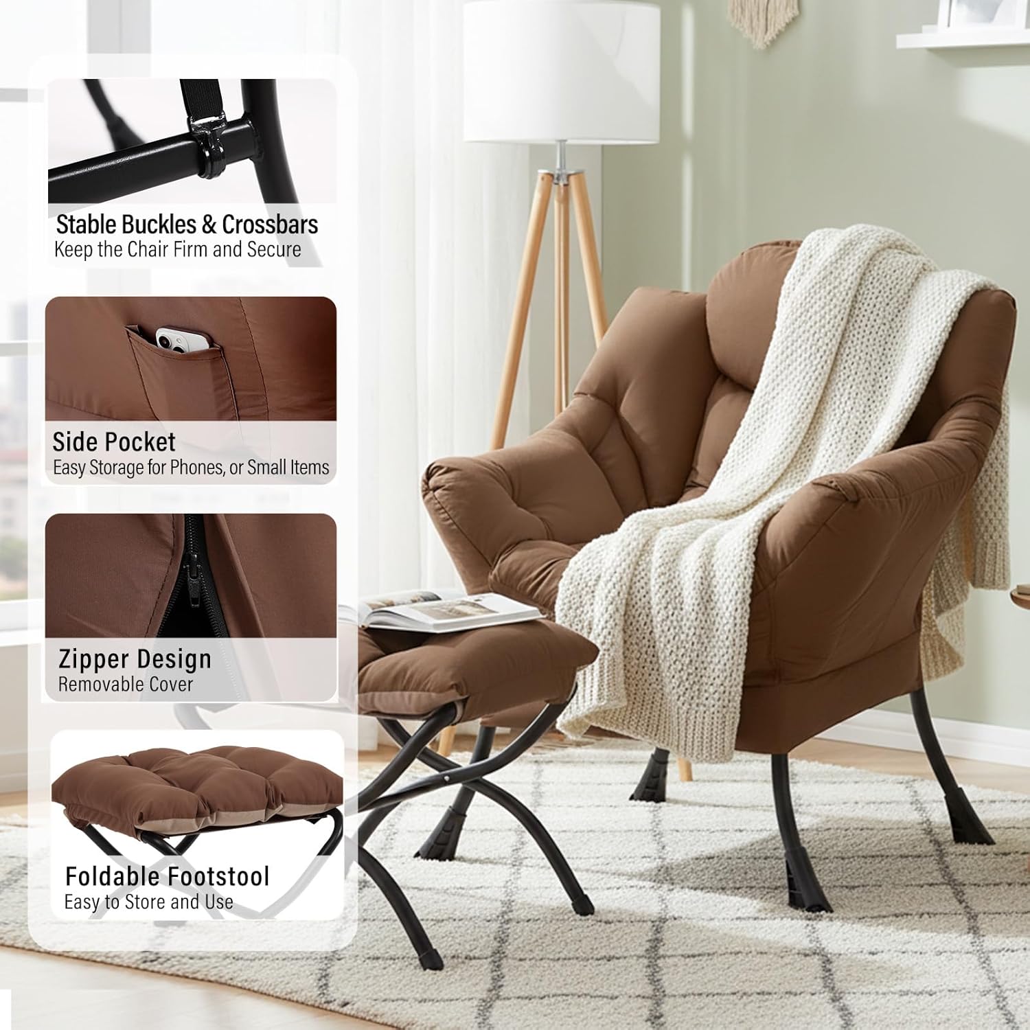 - 【STURDY & STABLE LAZY CHAIR】 Crafted with a durable steel frame, this arm chair is designed for everyday comfort and stability. Equipped with non-slip foot covers to protect your floors and help provide a stable seating experience on any surface. The ottoman features a convenient folding design, making this living room chair space-saving and easy to store.