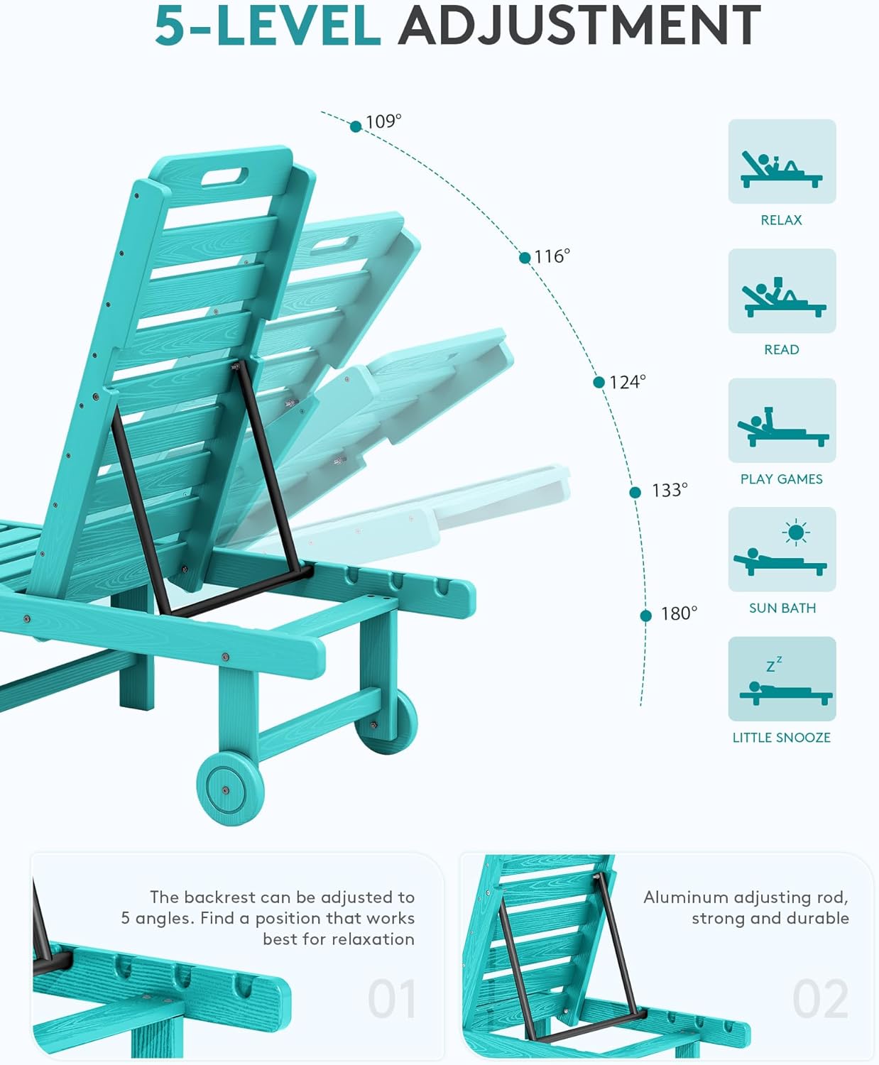 - 5-Position Adjustable Backrest: Our chaise lounge outdoor offers a versatile 5-position adjustable backrest, allowing you to freely switch between sitting and lying down. Whether you prefer sunbathing, tanning, reading or taking a nap, you can find your perfect angle