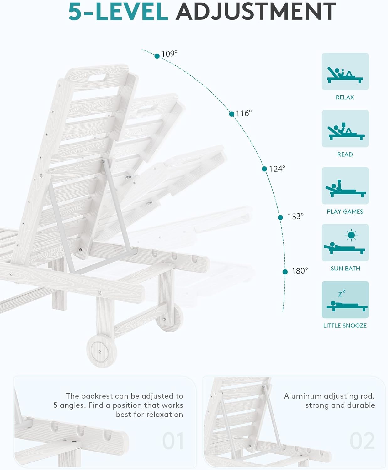 • Rolling Wheels & Handles: This patio chaise lounge comes with convenient rolling wheels and handles, pull on the handle to move it easily to follow the sun or find shade. Enjoy the sun and warm weather on this adjustable chaise lounge, our hdpe lounge chair is perfect for poolside, patio, garden, beach, or deck