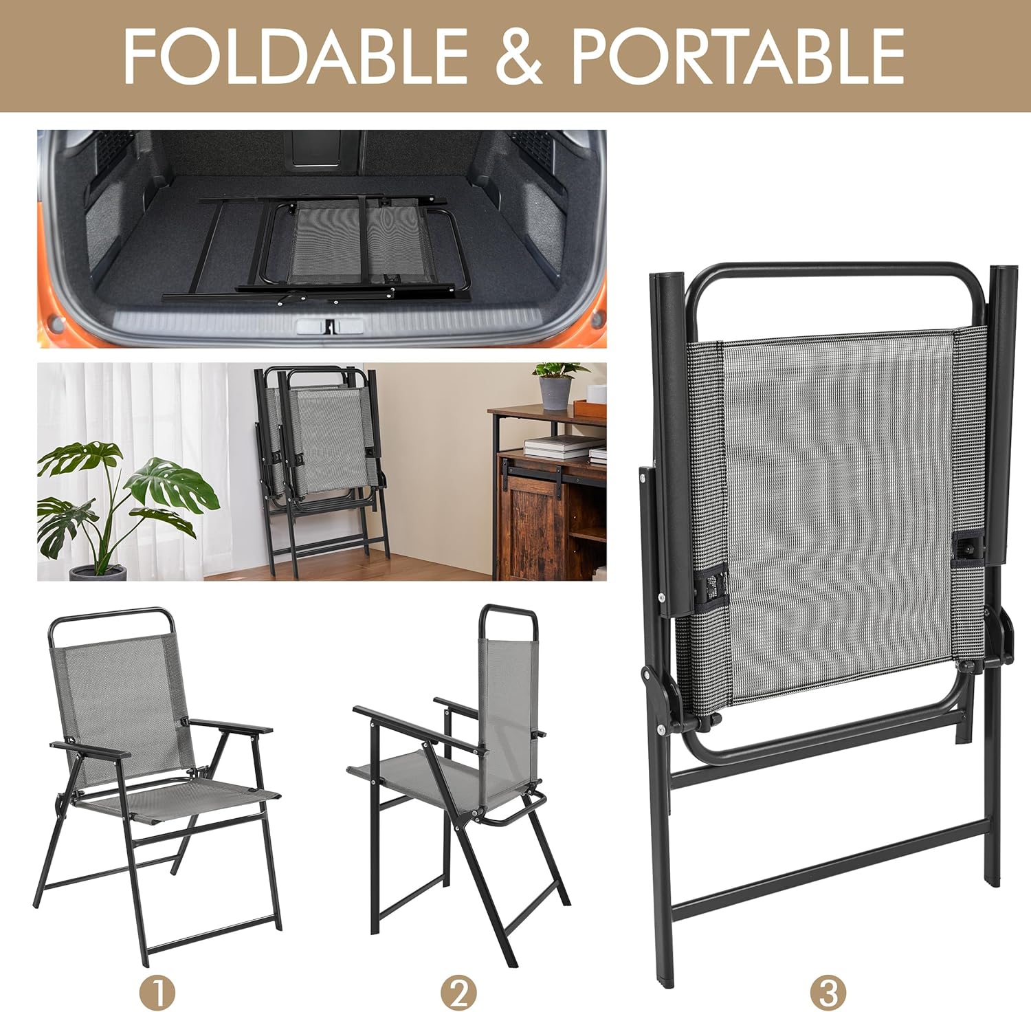 - Foldable Design: When you want to store or move this patio dining chair, you can fold it into a piece of 35″ L × 23″ W × 2.5″ Thickness piece to keep in your garage or on your storage shelf. If you have limited outdoor space, this dining chair is also your ideal solution to save valuable space