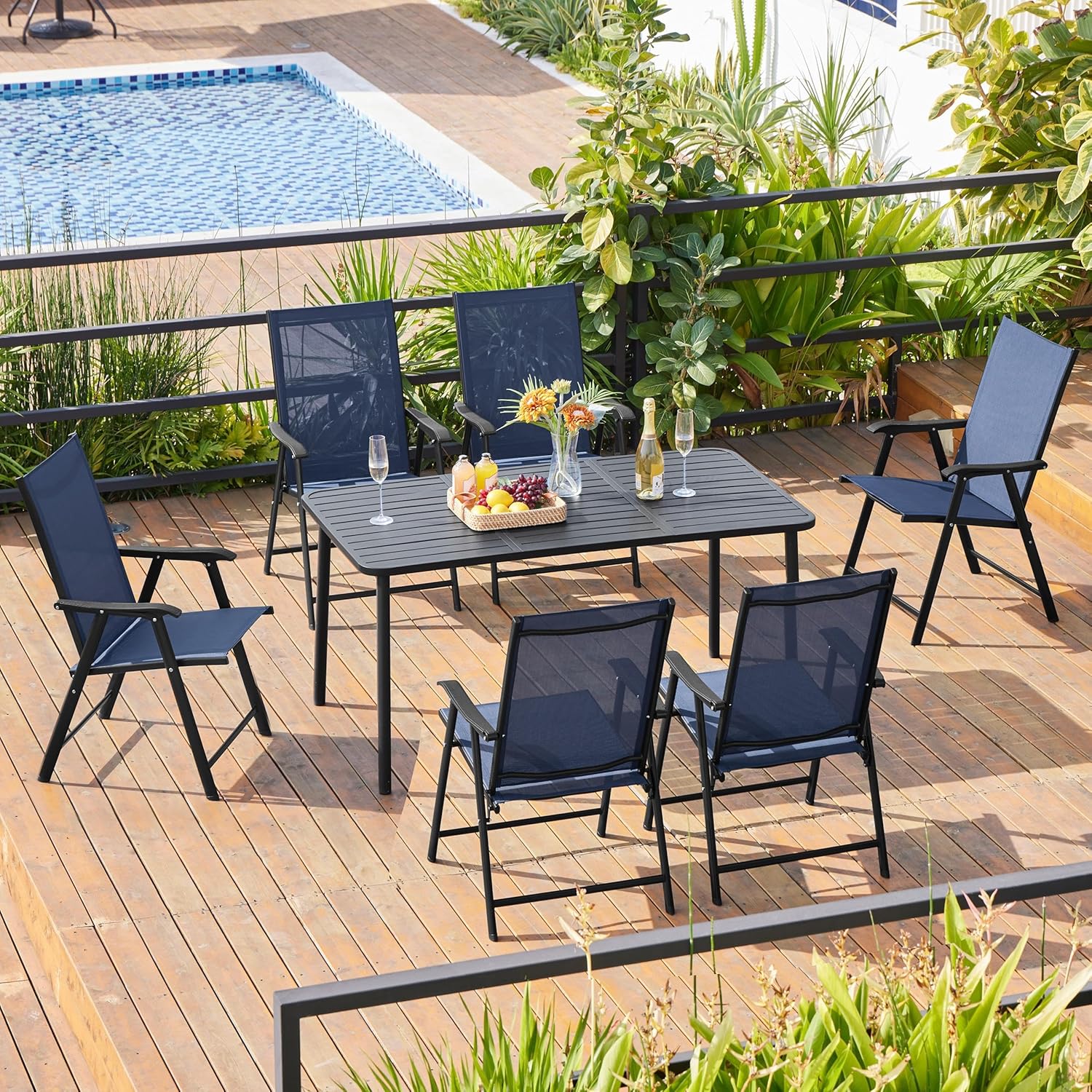 - Foldable for Easy Storage: This patio dining chair set can be folded into an 34″ L × 22″ W × 6.5″ Thickness piece weighing (each) 11.2 lb, stress-free to be kept in your garage, trunk, or on a storage rack. If your outdoor space is limited, this set would be your ideal solution