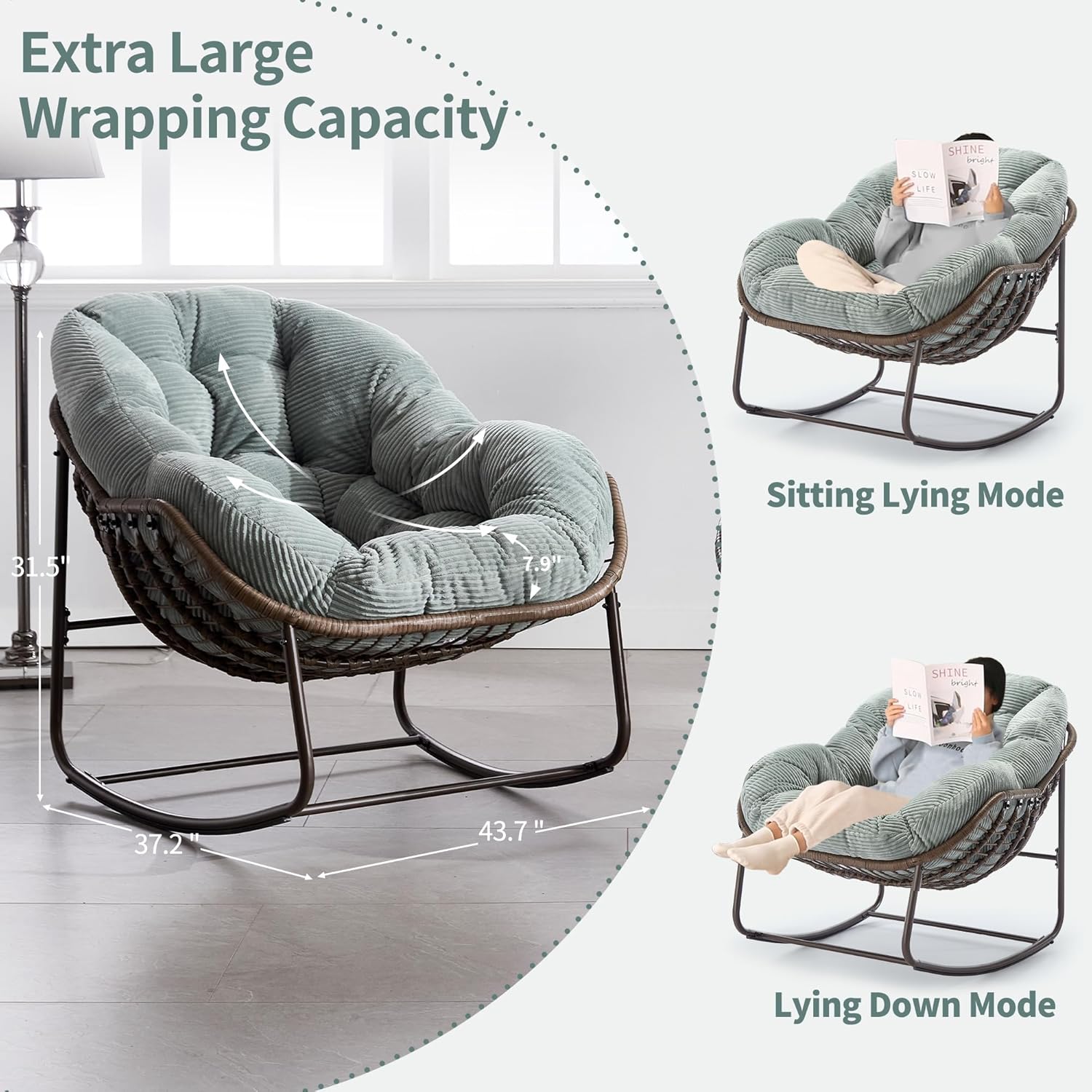 - EGG SHAPED ROCKER: This large egg rocking chair measures 43.7" D x 37.2" W x 31.5" H, it has an elegant egg shape that wraps you in its comfortable structure and swings 30° back and forth, rocking gently and smoothly to give you maximum comfort to rest