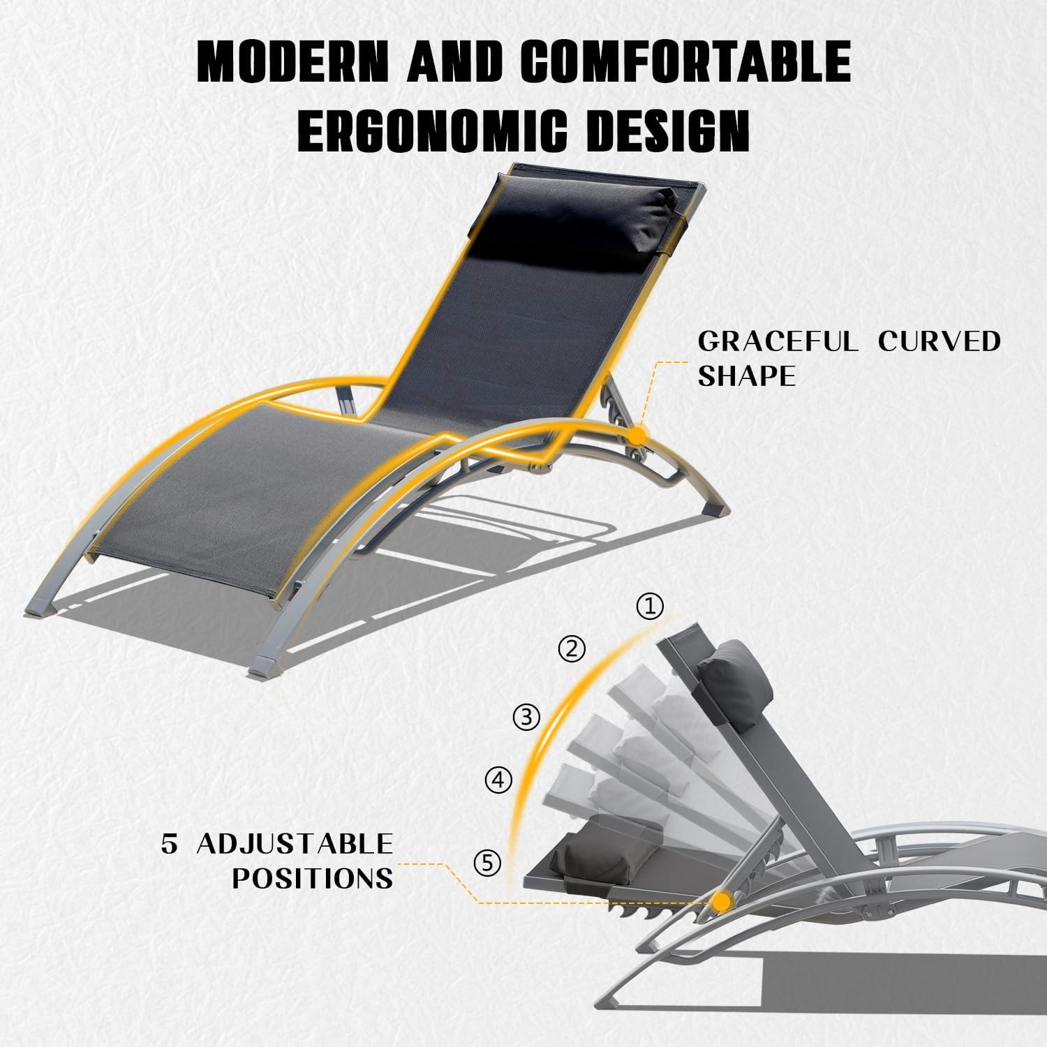 - [5 Adjustable Positions] This chaise lounge outdoor can be adjusted at 5 adjustable positions as your needs. No matter what your position you choose, the headrest can provide the best neck support.
