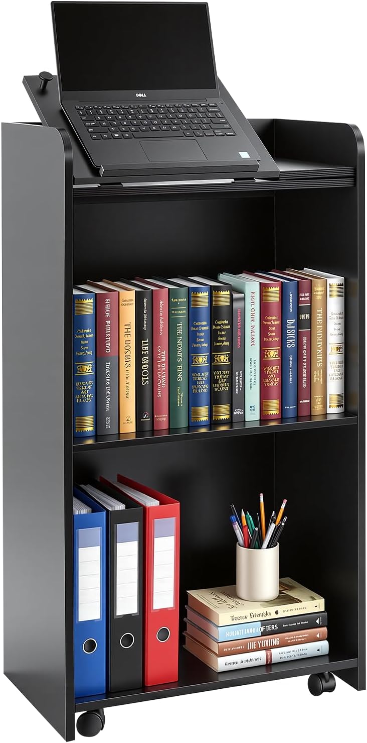 - 【Large 3-Tier Storage for All Your Needs】 Keep your presentation organized and clutter-free with 3 spacious shelves. The top surface fits laptops up to 17 inches, the middle shelf holds books, folders, and teaching materials, and the bottom shelf is perfect for binders and extra supplies. Everything you need is within arm's reach, making your presentation smoother and more professional.