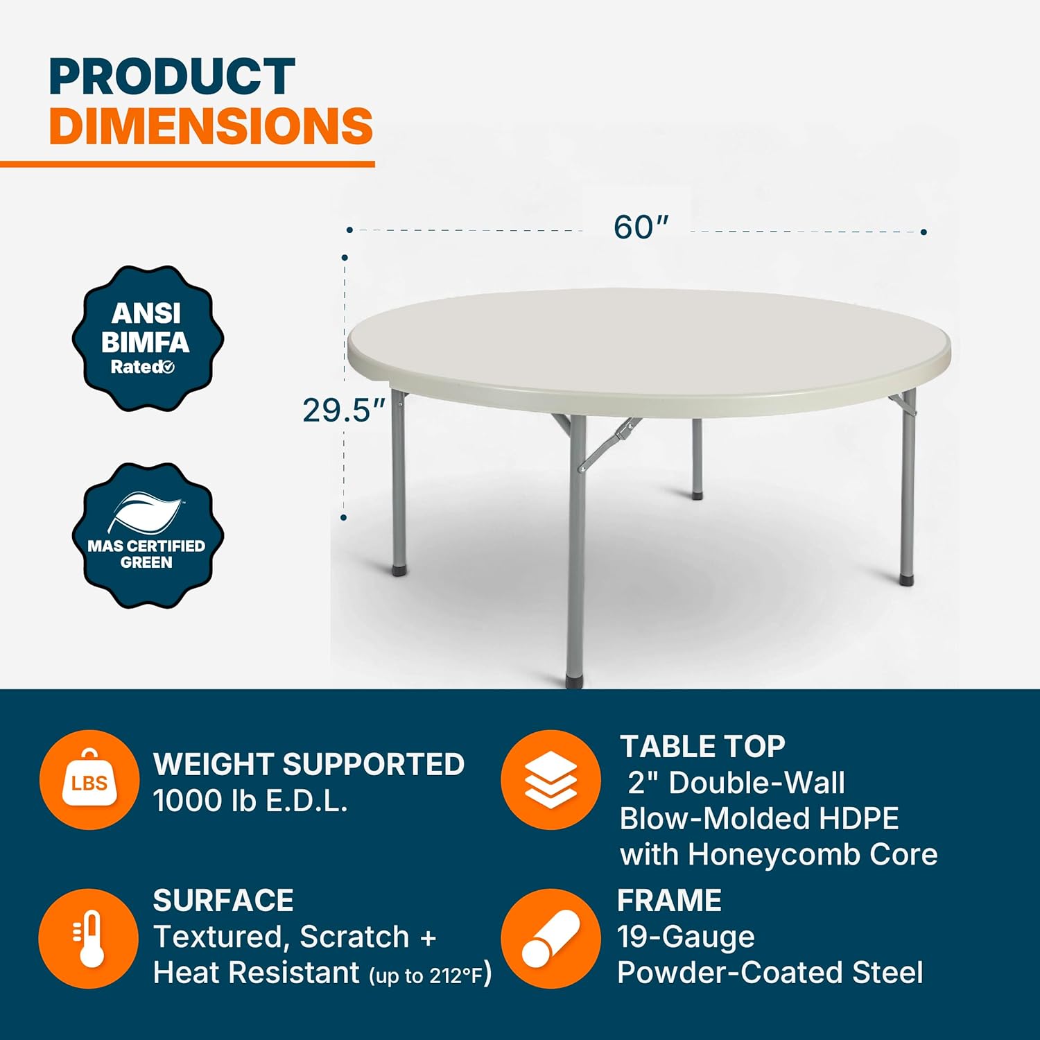 1.【 WHAT SETS US APART 】 Most round tables claim strength—few deliver it. The Series does. Its 2" double-wall blow-molded HDPE top with a reinforced honeycomb core won’t sag, dent, or bow, even under 1,000 lb of evenly distributed weight. Heat-resistant up to 212°F and lightly textured for scratch resistance, it provides a dependable surface that’s both tough and easy to clean. Beneath it, a powder-coated steel frame delivers commercial-grade strength—19-gauge steel on the 48" and 60" models, upgraded to 17-gauge steel on the 72" model for extra reinforcement where it counts.