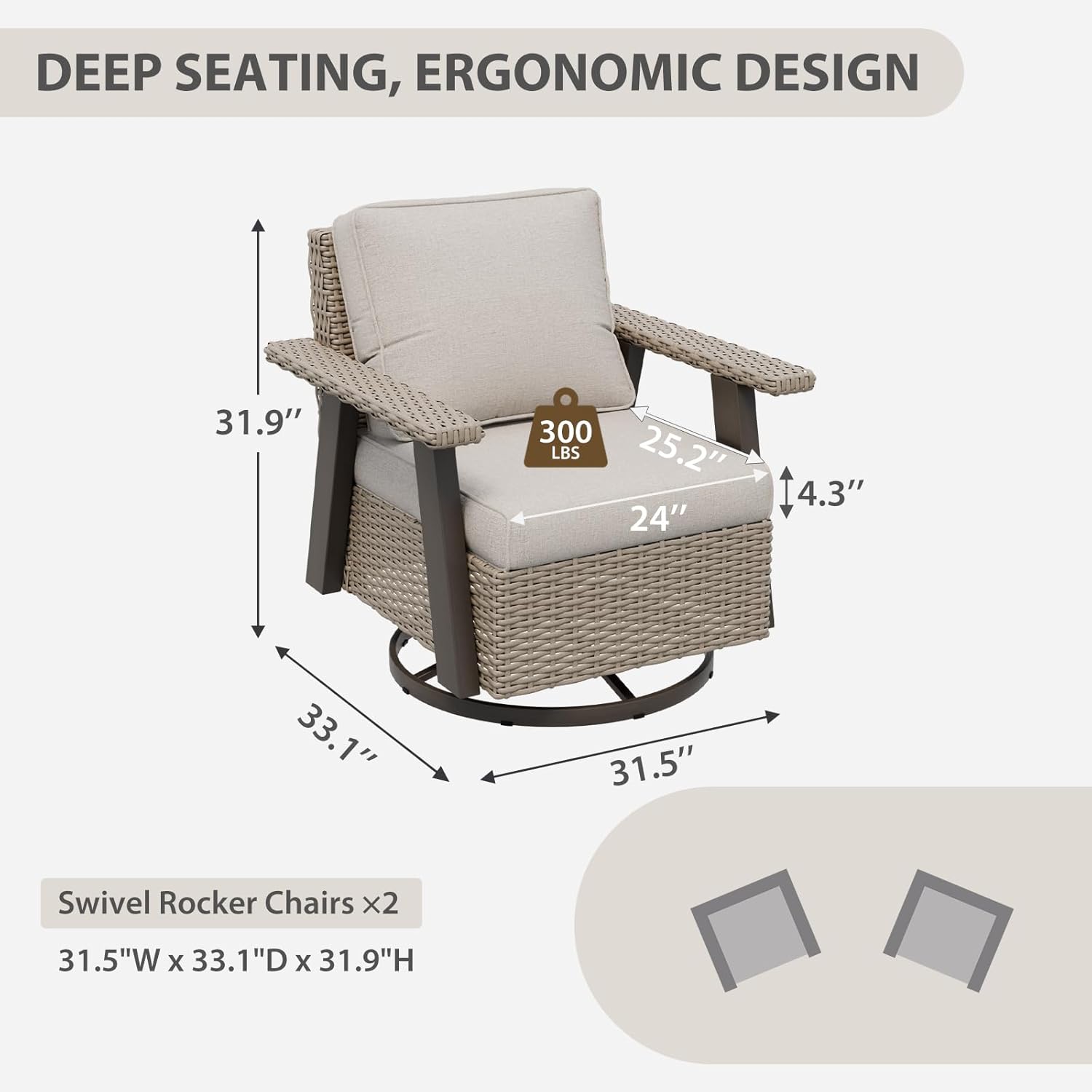 - SEAMLESS PATIO SET: Designed for vesatility, this wicker patio set features 2 swivel chairs with dimensions of 31.5"W x 33.1"D x 31.9"H. Its compact structure and elegant appeal enable it to fit seamlessly into diverse furniture settings without sacrificing comfort, from a cozy balcony to a serene backyard