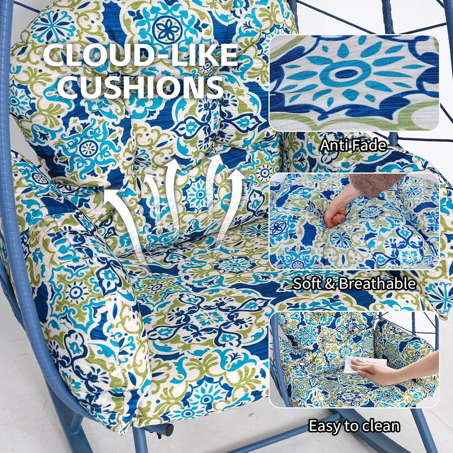 - 【Thick & Soft Cushion】Our oversized large swing egg chair has an ergonomic backrest design and is paired with a thickened soft cushion and a pillow. The pillow is made of polyester material and cotton inserts for added comfort. The durable laces on the cushion can be securely securely attached to the hammock chair easily. The thickened cushion has good support and cushioning for an extremely soft and relaxing seating experience