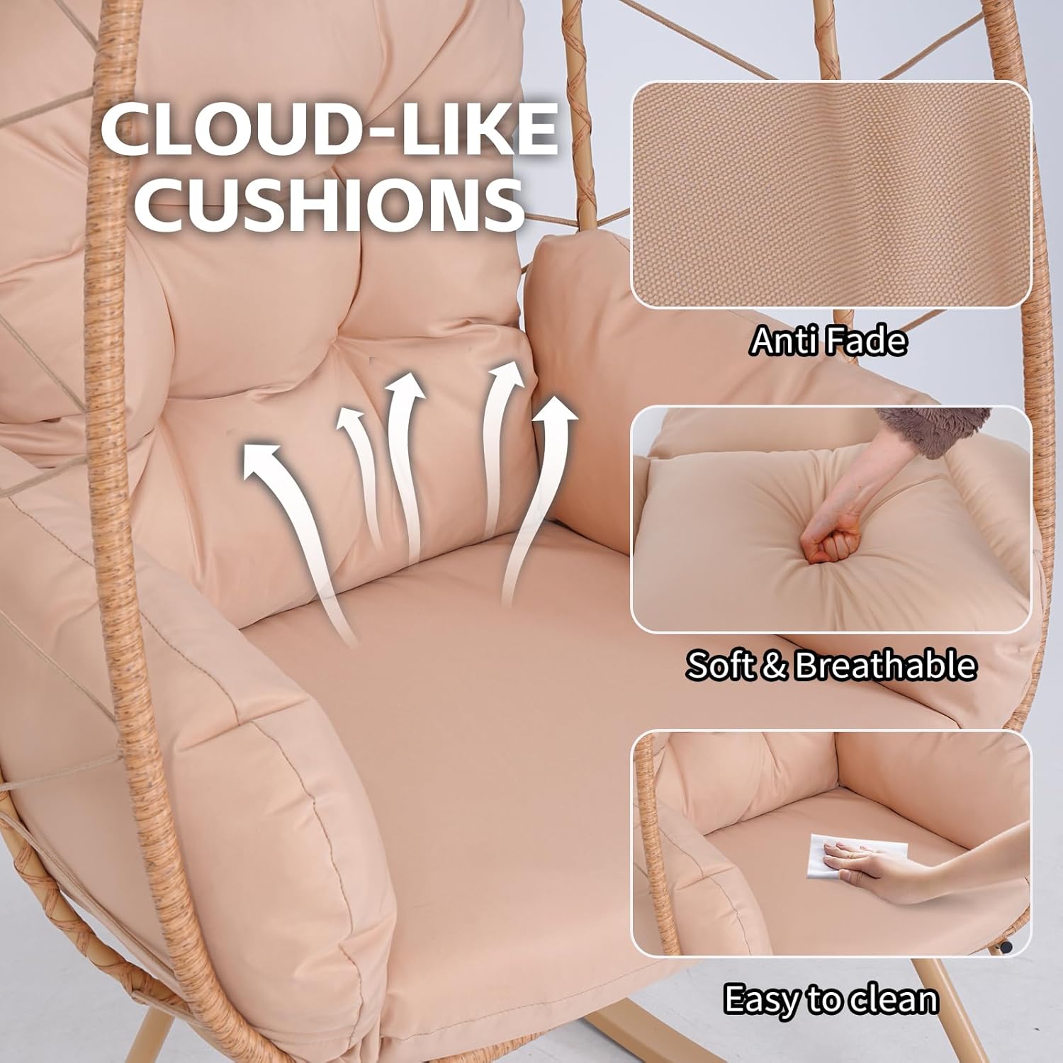 - 【Thick & Soft Cushion】Our oversized large swing egg chair has an ergonomic backrest design and is paired with a thickened soft cushion and a pillow. The pillow is made of polyester material and cotton inserts for added comfort. The durable laces on the cushion can be securely securely attached to the hammock chair easily. The thickened cushion has good support and cushioning for an extremely soft and relaxing seating experience