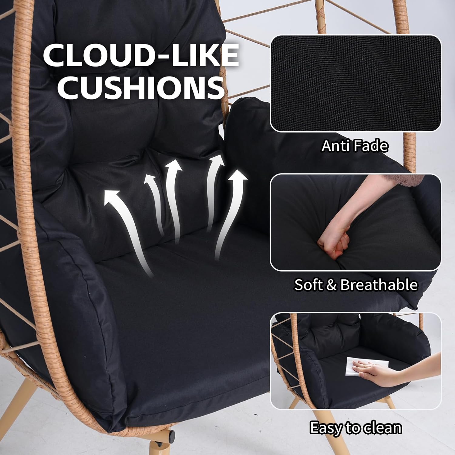- 【Thick & Soft Cushion】Our oversized large swing egg chair has an ergonomic backrest design and is paired with a thickened soft cushion and a pillow. The pillow is made of polyester material and cotton inserts for added comfort. The durable laces on the cushion can be securely securely attached to the hammock chair easily. The thickened cushion has good support and cushioning for an extremely soft and relaxing seating experience