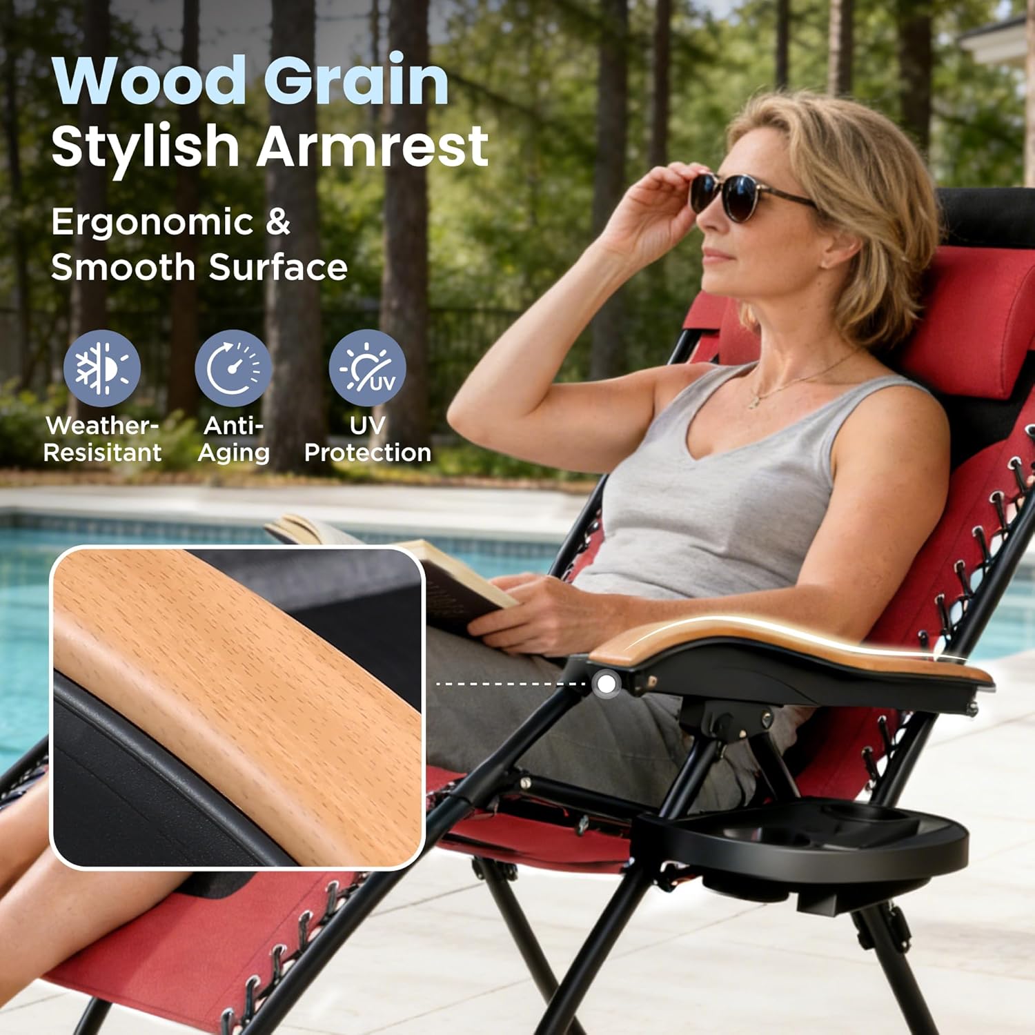 - Padded Seat & Back: Fully padded seat suspended by double bungee system provides more comfort and durability. Extra-large wood-like pattern armrests provide soft support for this zero gravity chair. Cup tray is included for holding drinks or food.